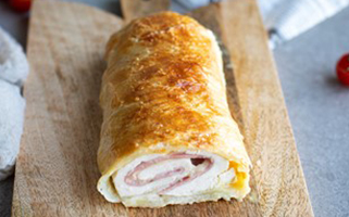 Hojaldre enrollado de pollo relleno de fuet de jabalí a las finas hierbas y queso |
