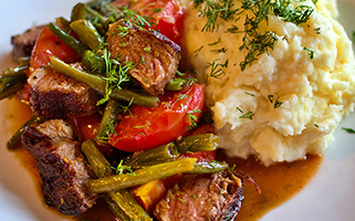 El ciervo flambeado al cognac en salsa de nueces de Montes Universales ya está listo para calentar y servir. Por eso sólo debemos preocuparnos de su acompañamiento. En este caso prepararemos un puré de patatas. Cocemos las patatas enteras y sin pelar durantes unos 30 minutos, hasta que al pincharlas con un cuchillo, no ofrezcan resistencia. Las pelamos con un cuchillo y las chafamos con un tenedor. Añadimos la mantequilla a temperatura ambiente y seguimos mezclando. A continuación, añadimos la leche un poco caliente hasta que quede con la textura que queremos. Rectificamos de sal. Calentamos el ciervo flambeado y le añadimos el puré. ¡Un plato gourmet listo en muy poco tiempo! |