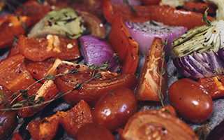 Limpiamos y cortamos las verduras. Las ponemos en una bandeja para horno y echamos un poco de aceite de oliva. Salpimentamos y ponemos encima un poco de tomillo fresco u otra hierba aromática.