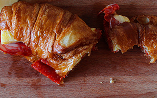 Cortamos unos trozos finos de chorizo sarta de jabalí Montes Universales y unos trozos más gruesos de parmesano. Abrimos el cruasán por la mitad y añadimos el chorizo y el queso. Un desayuno facilísimo y riquísimo.
