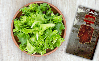 Ponemos la ensalada en un bol junto con los tomates cherry y añadimos la vinagreta. Colocamos los trozos de cecina de jabalí Montes Universales por encima y, podemos, también, poner unas cuantas pipas y pistachos enteros por encima.