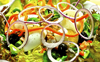 Ponemos la lechuga variada en un bol grande y añadimos la cebolla y la zanahora cortadas finas, y las aceitunas negras. Aliñamos con sal, pimienta y aceite y mezclamos bien todos los ingredientes.
