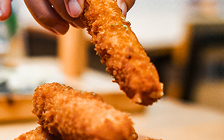 Cortamos el queso mozarella en dedos. Lo pasamos por harina, huevo, pan rallado y, de nuevo, por huevo y pan, para que quede bien crujiente.