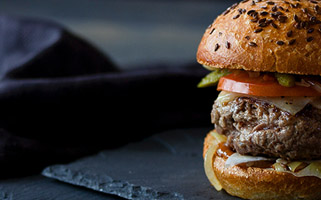 Tostamos el pan de hamburguesa levemente y añadimos la mayonesa y la cebolla caramelizada. Ponemos la hamburguesa con unas rodajas de tomate y unas hojas de lechuga por encima. Cerramos el bocadillo y ¡listo para comer!