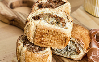 Expandimos la masa de hojaldre sobre una superfície plana y la partimos por la mitad. Cogemos una de las mitades y ponemos una tira de nuestra mezcla. Hacemos lo mismo con la otra mitad. Pintamos con el huevo batido.