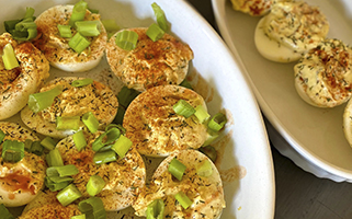 Rellenamos los huevos con la mezcla y ponemos un poco de pimienta y pimentón por encima. También se puede añadir un poco de cebolleta por encima.