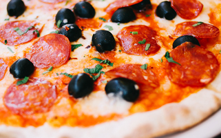 Preparamos la masa de pizza y añadimos 6 cucharadas de tomate frito en aceite de oliva Botularium, la mozzarella y los trozos de chori-fuet de jabalí Montes Universales cortados bien finos. Añadimos las aceitunas negras y el orégano y lo horneamos hasta que la masa esté crujiente.